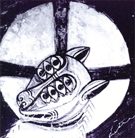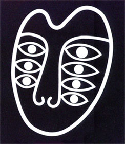 スペインのカタルニア美術館にある壁画、7つの眼を持つ万能の「黙示録の子羊」から、多くの観察・表現の眼を持つようイメージしてつくられた現展マークです。 |